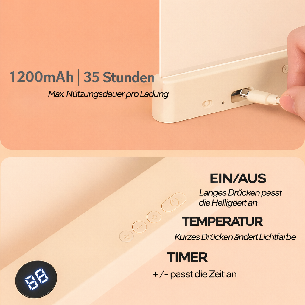 Wählen Sie zwischen warmem, neutralem oder weißem Licht und genießen Sie bis zu 35 Stunden Akkulaufzeit pro Ladung.